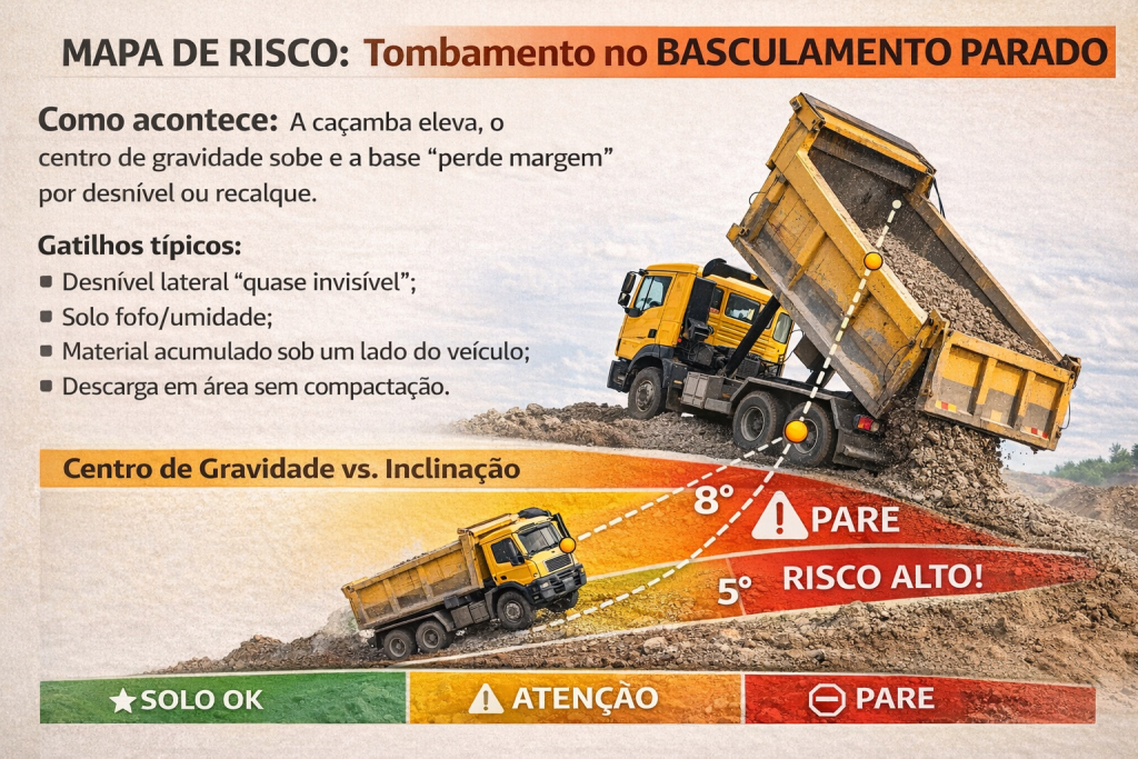 Como acontece: a caçamba eleva, o centro de gravidade sobe e a base “perde margem” por desnível ou recalque.