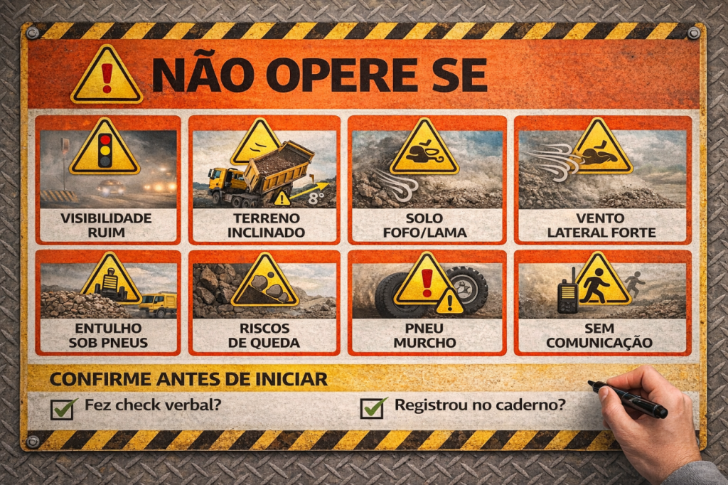 - ✅ Visibilidade adequada; em baixa visibilidade, suspenda a operação (especialmente em frentes de basculamento).